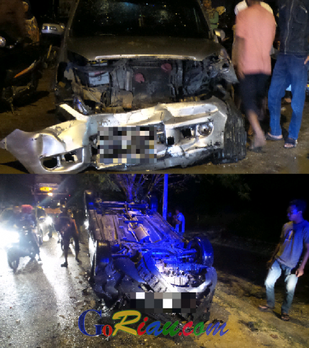 Namun, Khairul yang tidak melihat adanya mobil Xenia yang dikemudikan Zulkifli berada di jalur berlawanan bergerak dari timur menuju bara. Kecelakaan pun tak terelakkan, mobil Ford jenis sedan hatchback itu langsung ‘beradu kambing’.Karena saat kejadian Khairul mengemudikan mobilnya cukup kencang, membuat mobilnya terjungkal dan terbalik di bahu jalan. Saat bersamaan, tiba-tiba sepeda motor Yamaha Jupiter MX yang dikendarai Amirudin (35) dan istrinya Nur Aisyah menabrak bagian belakang mobil Xenia.Akibat kejadian itu, Ana Susanti mengalami cidera berat dan dirawat di RS Awal Bross, Amirudin mengalami luka di tangan kanan dan dibawa ke pengobatan alternatif, sedangkan istrinya Nur Aisyah mengalami luka di kaki kiri dan dirawat di RS Syafira.”Sementara itu, barang bukti, dua unit mobil dan satu sepeda motor sudah kita evakuasi ke unit Laka Satlantas Polresta Pekanbaru untuk kepentingan penyidikan dan proses hukum,” kata Kasat Lantas Polresta Pekanbaru, Kompol Budi Setiawan, Minggu pagi.”Sedangkan dua pengemudi mobil nahas itu, Khairul dan Zulkifli hanya mengalami luka-luka dan cidera ringan. Diduga kecelakaan akibat mobil Ford melaju kencang dan tidak mendapat ruang gerak yang cukup untuk mendahului kendaraan di depannya,” tutup Kasat (adv)