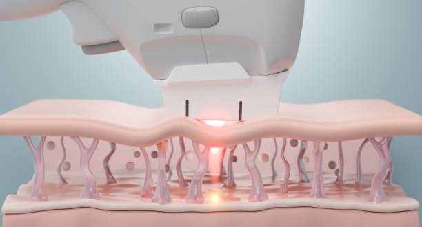 Close up Ultherapy or HIFU treatment shot laser to SMAS to lift and tighten skin, Blue science background. 3D rendering.