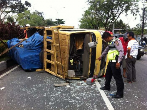 Kasatlantas Polresta Pekanbaru, Kompol Budi Setiawan,, menuturkan, penyebab truk terguling itu, diduga akibat out of control(hilang kendali).”Karena berusaha menghindar dari kendaraan yang ada di depannya yang tiba-tiba mengurangi kecepatan, dan akhirnya oleng dan terguling,” kata Kasat melalui selularnya. Masih kata Kasat, akibat kejadian itu, supir truk nahas tersebut menderita cidera pada tangannya dan saat ini telah dibawa ke rumah sakit terdekat untuk mendapatkan pertolongan medis, dan personel dari Unit Lantas Polsek Bukit Raya sudah di TKP.”Anggota kita sudah di TKP untuk mengevakuasi truk dari jalan agar tidak mengganggu arus kendaraan. Sedangkan supir mengalami luka ringan dan sudah kita bawa ke rumah sakit,” terangnya (adv)