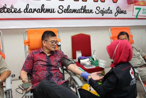 PEKANBARUPOS.COM (PPC),PEKANBARU – Bekerjasama dengan Palang Merah Indonesia, Kantor Pusat PTPN V taja bakti sosial donor darah, Jumat. Dari lebih seratusan pendonor, terkumpul 89 kantung yang selanjutnya akan dikelola oleh PMI Pekanbaru.Kegiatan yang digelar di ruang Melati Kantor Pusat PTPN V Jalan Rambutan Pekanbaru tersebut, diselenggarakan bersempena dengan hari jadi Perusahaan yang ke-21. Turut mendonorkan darahnya, Direktur Utama PTPN V Mohammad Yudayat. Yudayat yang akrab disapa Yudi tersebut, tampak bersemangat dalam mendonor.”Kira-kira sudah 20-an kali,” sebut Yudi menjelaskan bahwa donor darah yang dilakukannya bukanlah donor yang pertama. Ia juga senang melihat atensi karyawan Kantor Pusat yang berbondong-bondong mendaftarkan diri untuk donor.”Atensi karyawan baik. Saya sangat apresiasi kepada karyawan yang bersedia mendonorkan darahnya,” tukas Yudi. ”Mudah-mudahan di momen-momen donor darah berikutnya, atensi seperti ini bisa tetap tinggi,” harapnya lagi.