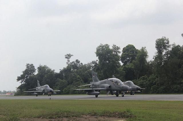 PEKANBARUPOS.COM (PPC),PEKANBARU – Lima unit jet tempur Hawk 100/200 dari Skadron Udara 12 Wing 6 Pangkalan Udara Roesmin Nurjadin menyelesaikan misi latihan tempur dan patroli perbatasan dengan sandi “Lintas Elang-17”.