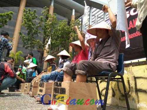 PEKANBARUPOS.COM (PPC),PEKANBARU – Aksi solidaritas menolak pembangunan Pabrik Semen di Rembang digelar sejumlah aktivis Kota Pekanbaru, Provinsi Riau, Rabu siang. Mereka mencor kaki dengan semen, sebagai reaksi terhadap sikap pemerintah yang dianggap tidak pro terhadap rakyat.Aksi cor kaki ini berlokasi di Tugu PON, Jalan Cut Nyak Dien Kota Pekanbaru. Ada lima orang yang ikut serta, Tiga dari LBH Pekanbaru dan dua lainnya dari Walhi (Wahana Lingkungan Hidup Indonesia) Riau.Mereka nekat menyemen kaki di dalam kotak kayu, sebagai aksi solidaritas terhadap petani di Rembang, Jawa Tengah yang menolak pembangunan Pabrik Semen Indonesia. Selain Pekanbaru, aksi serupa juga sudah digelar di daerah lain.Lima orang itu duduk di kursi, menggunakan topi dari rotan sebagai ciri khas petani. Kaki mereka kemudian dibalut kain kasa. Setelah itu semen yang sudah dicampur pasir dan air dituangkan ke kotak kayu, tempat kaki mereka diletakkan.