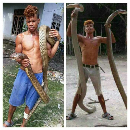 PEKANBARUPOS.COM (PPC),PEKANBARU – Pria tanpa baju berambut kriting mohawk ini membuat sejumlah Netizen media sosial ngeri-ngeri sedap. Kenapa tidak, dalam foto terlihat ia santai bermain dengan ular jenis King Kobra yang panjangnya lebih dari tiga meter.Bukan cuma satu ekor saja, melainkan dua King Kobra berukuran besar sekaligus. Ada beberapa foto yang mempertunjukkan kenekatan pria tersebut saat bercengkrama dengan ular paling mematikan ini, bahkan ada yang sengaja dililitkan ke badannya.Bukannya takut, wajah pria tanpa baju dan hanya mengenakan celana pendek ini justru terlihat santai. Bahkan salah satu fotonya yang bikin seram, saat lelaki tersebut mengangkat dua King Kobra sekaligus, sehingga terlihat seperti ular yang sedang berdiri.Foto-foto pria ini diunggah akun facebook bernama M Iral Septiadi, 30 Maret 2017 kemarin. Dalam gambar itu dia menuliskan “Panjinya Riau, Om Ice, Desa Mentulik Sungai Pagar Provinsi Riau. Besok berhenti main Lovebird, lebih maco gantang King Cobra sepertinya.”