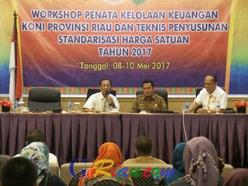 PEKANBARUPOS.COM (PPC),PEKANBARU – Komite Olahraga Nasional Indonesia (KONI) Riau menggelar Workshop Penata Kelolaan Keuangan KONI Riau dan Teknis Penyusunan Standarisasi Harga Satuan Tahun 2017, Selasa, yang dihadiri perwakilan dari Pengurus KONI serta pengurus cabang olahraga (cabor) Kabupaten/Kota.Kegiatan ini digelar atas permintaan pengurus KONI Kabupaten/Kota saat rapat anggota tahunan KONI Riau beberapa waktu lalu, untuk menyamakan persepsi yang berkaitan dengan pengelolaan keuangan dalam kepengurusan KONI dan cabor Kabupaten/Kota.Hal itu disampaikan Ketua Panitia, Romzen saat berbincang. disela-sela acara yang digelar di Hotel Royal Asnof, jalan Tuanku Tambusai (Nangka), Pekanbaru, Selasa siang.”Acara ini permintaan pengurus KONI Kabupaten/Kota. Kita (KONI Riau) hanya memfasilitasi. Tujuannya berkaitan dengan pengelolaan keuangan supaya lebih baik lagi,” kata Romzen.