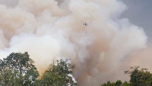 PT ARARA ABADI TURUNKAN REGU PEMADAM KEBAKARAN DAN 3 HELI HADANG KARHUTLA DI LUAR KONSESI DIPELALAWAN, 1.500.000 LITER AIR WATER DIBOMBING