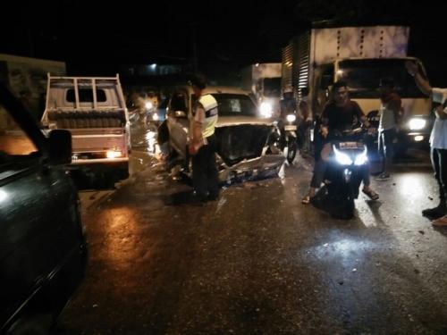 Laka Lantas yang terjadi di bawah guyuran hujan malam itu, melibatkan tiga kendaraan, dua roda empat dan satu roda dua. Akibat kejadian itu, dua mobil mengalami ringsek berat dibagian depan. Bahkan, mobil jenis Ford Fiesta terjungkal setelah menghantam Xenia dari arah lawan.